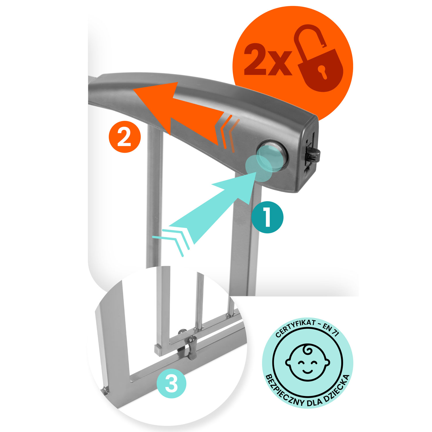 Aby prawidłowo otworzyć bramkę, należy najpierw nacisnąć przycisk boczny nr 1, a dopiero potem przesunąć uchwyt.