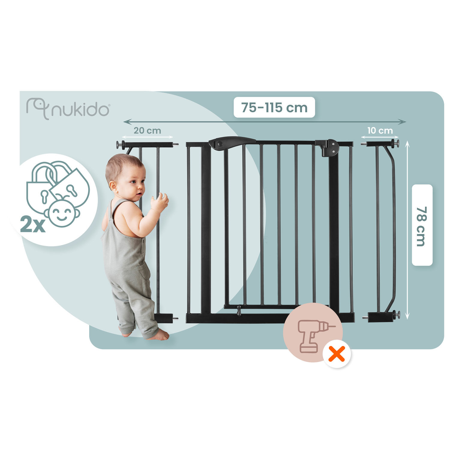 Barierka ochronna od Nukido jest mocowana rozporowo bez konieczności wiercenia otworów – nie zniszczysz ścian ani futryny.