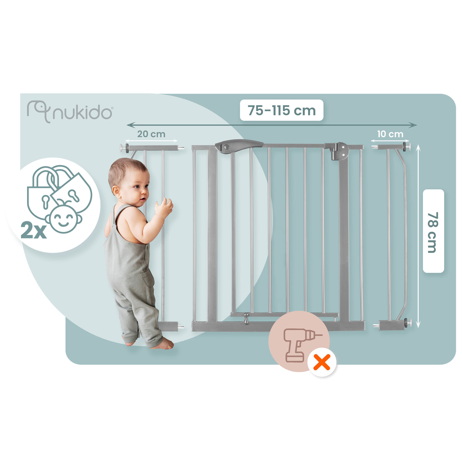 Barierka ochronna od Nukido jest mocowana rozporowo bez konieczności wiercenia otworów – nie zniszczysz ścian ani futryny.