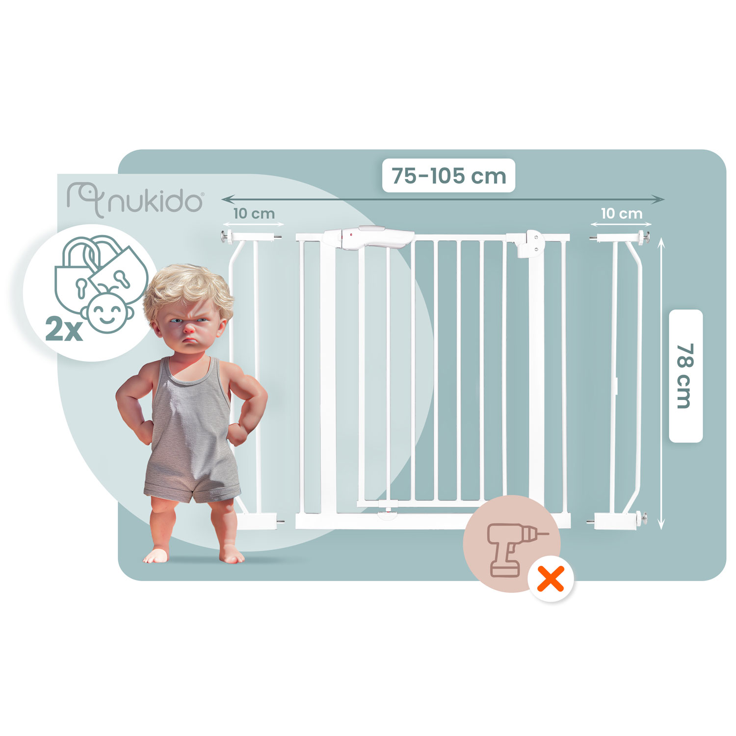 Barierka ochronna od Nukido jest mocowana rozporowo bez konieczności wiercenia otworów – nie zniszczysz ścian ani futryny.