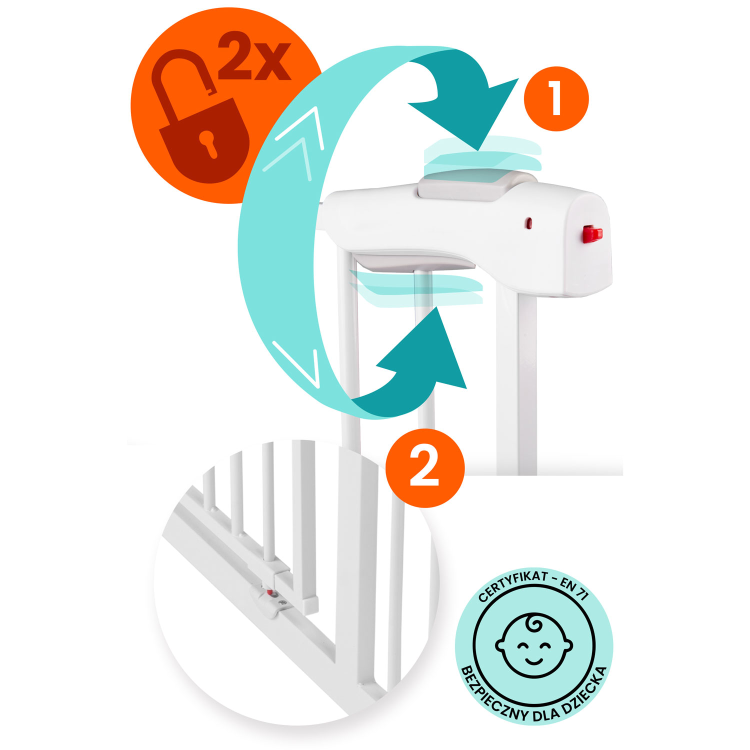 Z kolei sam przycisk 1 odblokowuje tylko górną część – dopiero jego połączenie z przyciskiem 2 umożliwia pełne otwarcie bramki.